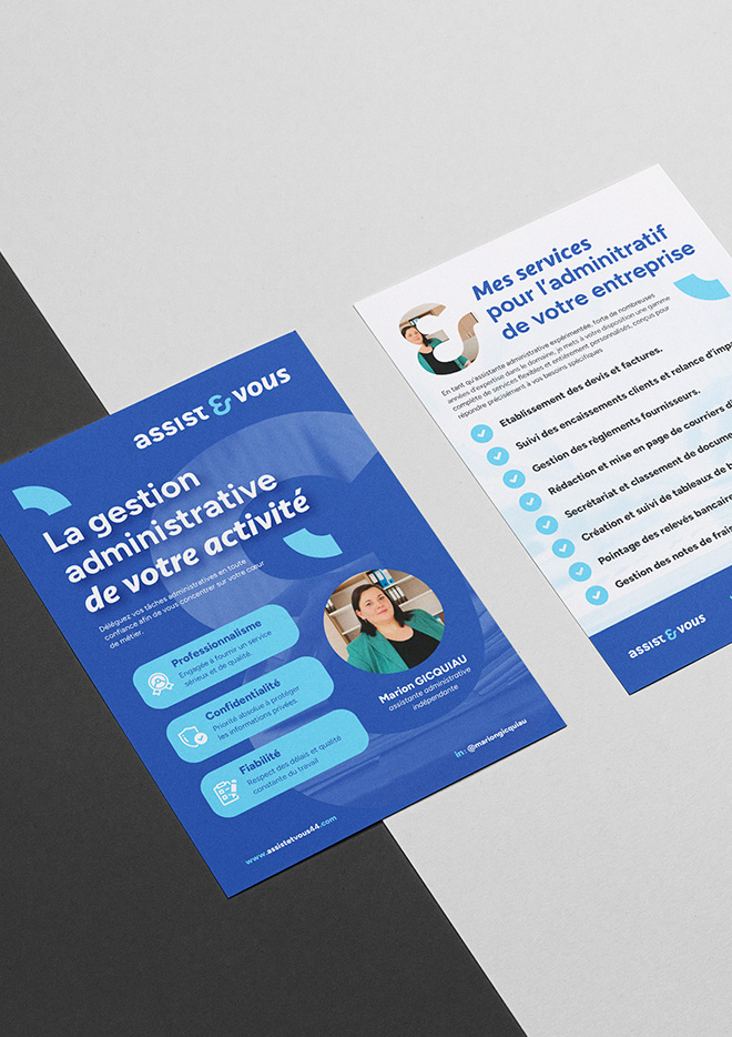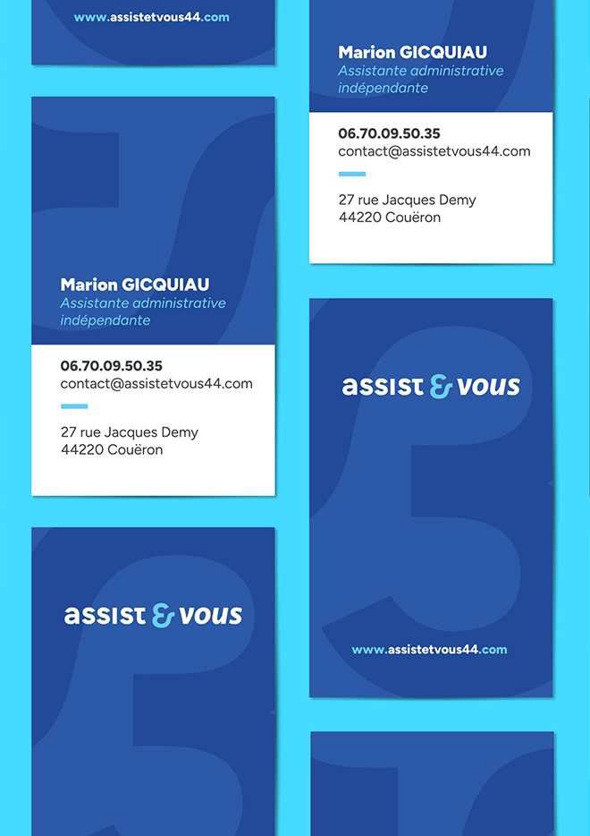 Réalisation d’un accompagnement complet pour le lancement de l’activité de Marion Gicquiau, assistante administrative indépendante. De la conception de l’identité visuelle à la réalisation des supports de papeterie (carte de visite, papier à en-tête, etc.), jusqu’à la conception et la réalisation de son site vitrine. Des supports de création sur mesure pour présenter et valoriser le savoir-faire de Marion à travers son entreprise Assist et Vous.