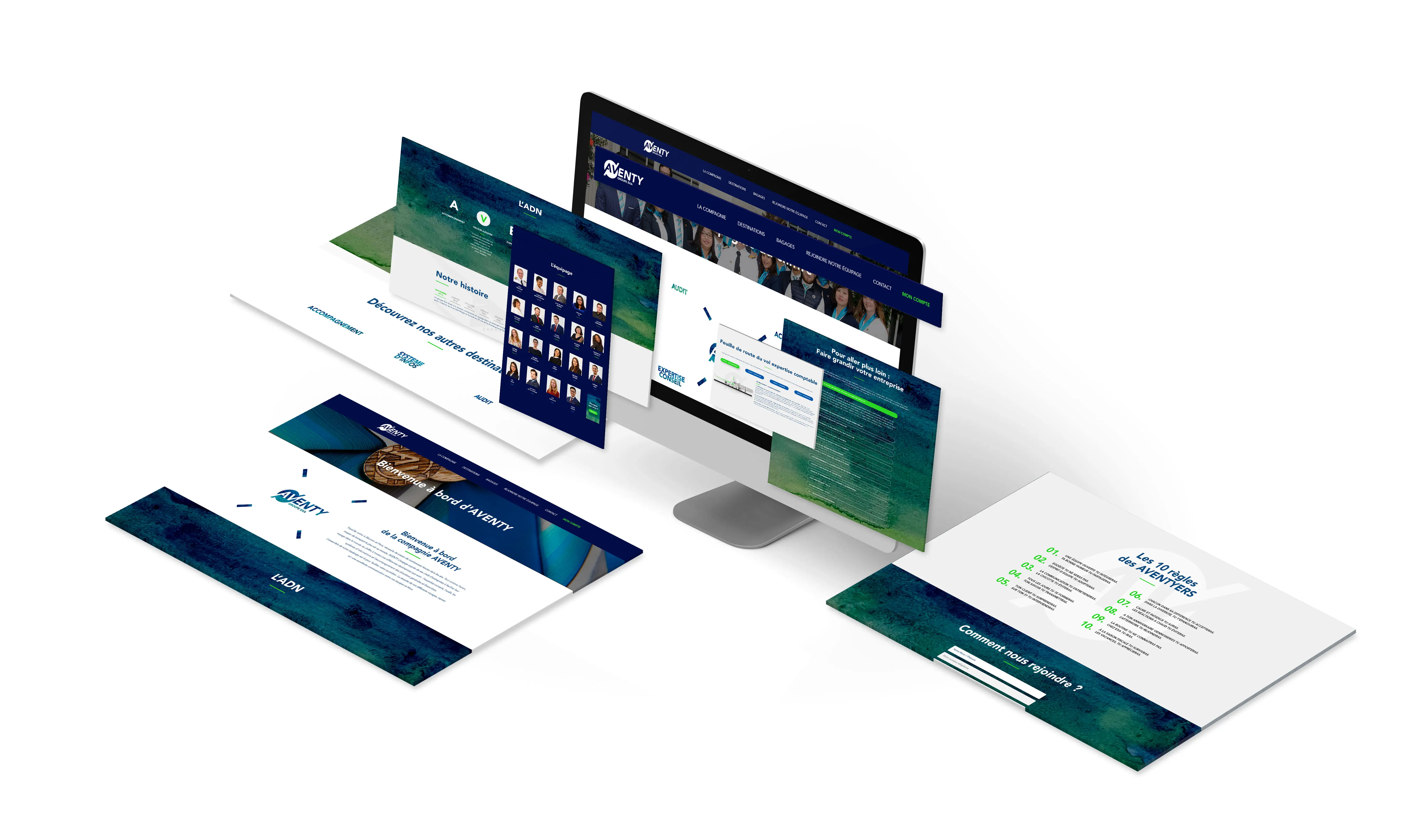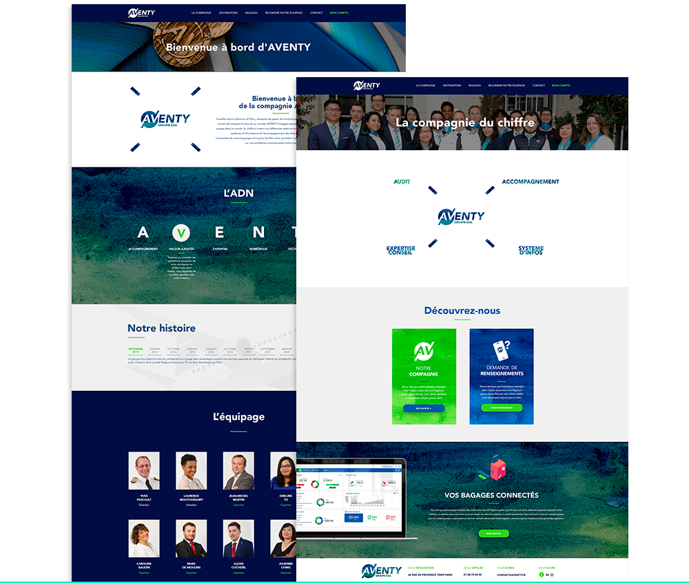 Réalisation d’un webdesign pour Aventy, un cabinet d’expertise comptable avec un concept original : utiliser l’image de la compagnie aérienne pour communiquer sur les accompagnements, les missions, les outils…