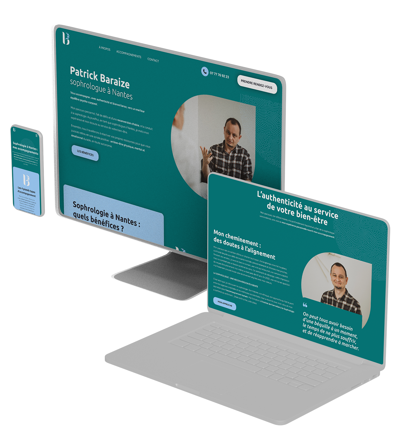 Dans le cadre de l’accompagnement global mené pour Patrick Baraize, sophrologue à Nantes, j’ai conçu et développé son site internet avec une attention particulière portée à la clarté, à la sérénité visuelle et à l’accessibilité de l’information. L’objectif : proposer une vitrine en ligne à son image, rassurante et professionnelle.
